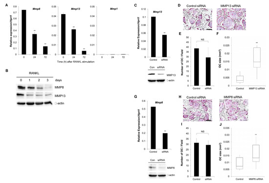 Matrix metalloproteases (MMPs) are family of proteolytic enzymes encoded by 24 genes in human [11] that are involved in diverse cellular and pathological events involving matrix remodeling [12]. Among those MMPs, collagenases are comprised of MMP1, 8, and 13 according to classification based on structural similarity and substrate specificity. The expression of collagenases has been observed in various cells in skeletal system, including osteoblasts and osteoclasts [13,14,15,16]. Notably, the role of collagenases in bone development and remodeling was demonstrated in MMP13-deficient mice, in which the endochondral ossification as well as the appearance of osteoclasts in the primary ossification centers are significantly delayed during embryogenesis [17,18]. In a more recent study, the role of MMP13 in adult skeleton was attributed to osteocytic perilacunar remodeling required for the maintenance of bone quality [19]. MMP8-deficiency led to a more severe alveolar bone loss in Porphyromonas gingivalis infection model [20] and increased joint inflammation and bone loss in serum transfer arthritis model [21]. However, the expression and function of collagenases, i.e., MMP1, 8, and 13, in osteoclasts are yet to be thoroughly studied.