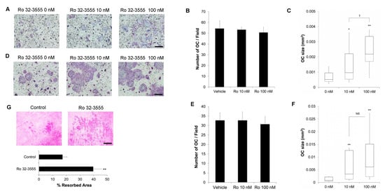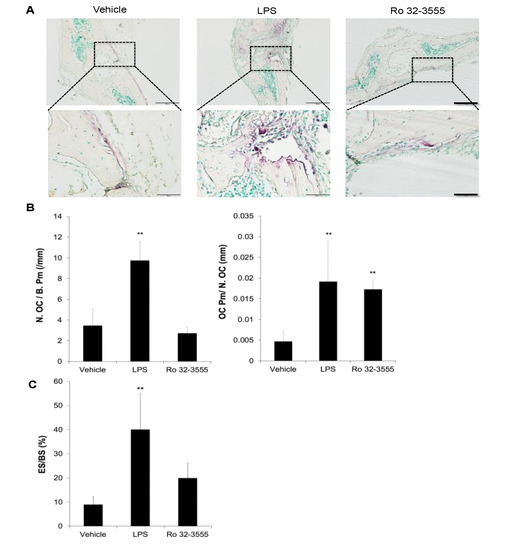 Collagen sheets (Zimmer Biomet, Palm Beach Gardens, FL, USA) were cut into pieces (10 × 10 mm, 1mm thick) and soaked in phosphate buffered saline (PBS), LPS (100 μg), or Ro 32-3555 (1 nmol). These collagen slabs were inserted onto the calvariae of 5-week-old female C57BL/6 mice. At 5 days after operation, calvariae were removed, fixed, and decalcified before processing for paraffin embedding. Tissue sections of 5 μm thickness were prepared using a Leica RM 2245 microtome (Leica Microsystems, Bannockburn, IL) and subsequently subjected to TRAP staining. Histomorphometric analyses for the number of osteoclasts per bone perimeter (N. Oc/B. Pm.), osteoclast perimeter per osteoclast (OC Pm/N. OC), and eroded surface per bone surface (ES/BS) were performed using OsteoMeasure software (OsteoMetrics, Decatur, CA, USA).
