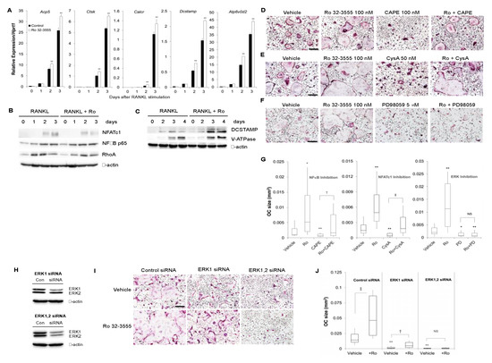 To dissect the molecular mechanisms involved in the regulation of osteoclast size by collagenase inhibition, the expression of osteoclast marker genes was first examined after the treatment of cells with Ro 32-3555 (Figure 4A). The addition of Ro compound induced a slight increase in the expression of osteoclast marker genes such as Acp5 (TRAP), Ctsk (cathepsin K), and Calcr (calcitonin receptor) compared with vehicle-treated control. In addition, Ro 32-3555 also elicited a similar slight increase in the expression of osteoclast fusion markers, Dcstamp and Atp6v0d2 (v-ATPase). The expression levels of osteoclast marker proteins were further tested by Western blot analyses (Figure 4B). The expression of NFATc1 was not remarkably affected by the treatment of cells with Ro 32-3555. Similarly, the expression of NFκB p65 as well as ras homologue gene family member A (RhoA) did not notably change in Ro compound-treated cells compared with control. Figure 4C confirms the increased expression of both DC-STAMP and v-ATPase proteins in Ro 32-3555-treated cells, in accordance with their increased mRNA expression levels. To further explore the signaling pathways involved in the increased osteoclast size following collagenase inhibition, the effect of pharmacological inhibitors was examined. The concentration of inhibitors was chosen not to completely shut down osteoclast differentiation to evaluate the contribution of each signal to the regulation of osteoclast size. In Figure 4D, the treatment of Ro compound induced significantly larger osteoclast size compared with control, while an NFκB inhibitor caffeic acid phenetyl ester (CAPE) [26] alone dramatically reduced it. However, Ro compound still greatly induced the formation of significantly larger osteoclasts even in the presence of CAPE (Figure 4G, left panel). Similarly, the inhibition of NFATc1 by cyclosporin A (CysA) [27] triggered the generation of small osteoclasts, while the addition of RO 32-3555 completely reversed the effect of CysA (Figure 4E,G, middle panel). Notably, however, Ro compound did not exert any effect on osteoclast size when cells were treated with an ERK pathway inhibitor, PD98059 [28] (Figure 4F,G, right panel). To further corroborate the role of ERK signaling in Ro compound-mediated osteoclast fusion, ERK expression was knocked-down in osteoclast precursors using siRNAs specific for ERK1 or ERK2 (Figure 4H). Western blot experiments confirmed the reduced expression of ERK1 (upper panel) and both ERK1 and ERK2 (lower panel) in BMMs treated with ERK1 siRNA and ERK1 plus ERK2 siRNA, respectively. When these cells were treated with Ro-32-3555 in the presence of M-CSF and RANKL, significant increase in the osteoclast size was observed in the control siRNA- and ERK1 siRNA-treated cells (Figure 4I,J). However, no such enhanced fusion was detected when both ERK1 and ERK2 expressions were knocked down.
