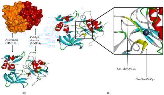 TIMPs consist of a N- and C-terminal domain with 125 and 65 amino acids, respectively, each containing six conserved cysteine residues, which form three conserved disulphide bonds [,,,,,,,] (Figure 2a). The N-terminal domain is an independent unit, which can be inhibited by MMPs, in a 1:1 ratio [,,,,,,,,]. This domain has two groups of four residues: Cys-Thr-Cys-Val and Glu-Ser-Val-Cys (Figure 2b), which are connected by disulphide bounds which are important for TIMP activity [,]. This is the main domain responsible for MMP inhibition through its binding to the catalytic site in a substrate-like manner []. The several domains allow the TIMP and pro-gelatinases interactions [].