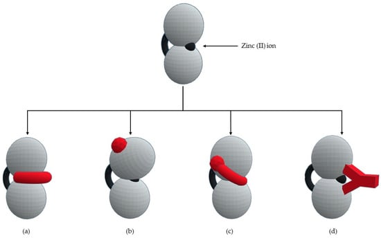Types of MMPs’ inhibitors: (a) endogenous-like inhibitors that chelate the catalytic zinc (II) ion; (b) exosite targeting inhibitors that alter the conformation of the enzyme; (c) a combination of exosite binding and metal chelating inhibitors; (d) antibodies inhibitors.