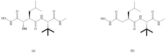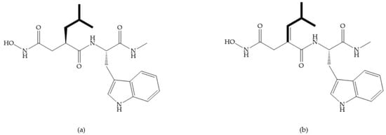 Marcq et al. [] developed succinyl hydroxamates derivates selective for MMP-2, by modifications on Ilomastat structure (Figure 14a) to increase the overall hydrophobicity and, consequently, the selectivity []. This study resulted in a compound (Figure 14b) with an isobutylidene group of E geometry, which showed a 100-fold greater selectivity for MMP-2 over MMP-3, that is a 70-fold increase compared to Ilomastat [].