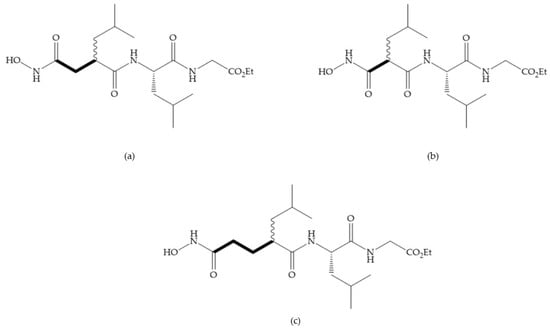 Several studies by Jonhson et al. [] demonstrated that derivatives of succinyl hydroxamic acid (Figure 13a) are more potent for MMP-1 than the corresponding malonyl (Figure 13b) or glutaryl (Figure 13c) derivates.