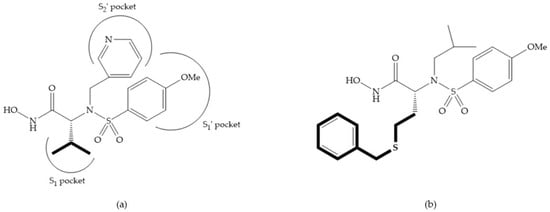 In 1995, Novartis described the CGS-27023A (Figure 15a), a non-peptidic MMP-3 inhibitor, which has good oral availability but did not succeed in clinical trials []. The isopropyl group slows down the metabolization of the adjacent hydroxamic acid group and the 3-pyridyl substituent may aid partitioning into the hydrated negatively charged environment of the cartilage []. By analysis of the cocrystal structure of this inhibitor and MMP-12, it was possible to conclude that the binding mode between the hydroxamate moiety and the catalytic zinc ion was the same as the binding mode of hydroxamate-based inhibitors []. The interaction of CGS-27023A with MMP-3 was possible due to the p-methoxy phenyl substituent occupation of the S1’ pocket and the pyridylmethyl and isobutyl groups occupation of the S2’ and S1 pockets, respectively [,]. The modification of α to form the thioester derivate led to an increase of the inhibition of the deep pocket of the MMPs [,] (Figure 15b).