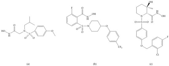 The NNGH (Figure 16a) (N-Isobutyl-N-(4-methoxyphenylsulfonyl)glycyl hydroxamic acid) was the starting point to many potent MMPis and is accommodated in the entry of the S1’ pocket, but does not penetrate it []. Barta et al. described a series of arylhydroxamate sulphonamides, active against MMP-2 and -13 (Figure 16b) []. In this compound, the sulfonyl group formed a single hydrogen bond with Leu160 and the piperidine-O-phenyl moiety extends into the S1’ pocket by Van der Waals interactions []. Noe et al. described a series of 3,3-dimethyl-5-hydroxy pipecolic hydroxamic acid, which possess potent inhibitory activity for MMP-13 []. In the first series of compounds, the 3-position of the piperidine ring was explored by the introduction of a polar functionality and it resulted in a compound with excellent activity on MMP-13 (Figure 16c), improved bioavailability, and lower metabolic clearance [].