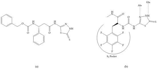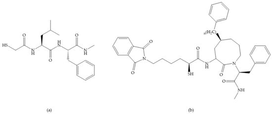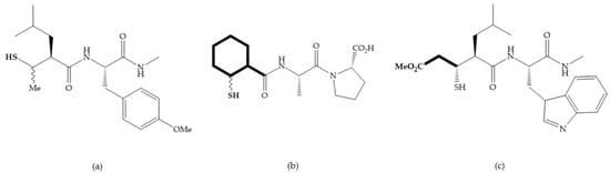 MMPs are molecular targets for the development of therapeutic and diagnostic agents []. The development of synthetic MMP inhibitors was initially based on the peptide sequence, recognized by proteases, with different chemical functionalities, capable of interacting potently with zinc ion [,,,]. The requirements for an effective inhibitor are [,,,,,]: