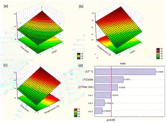 (a) Surface response chart of the 23 factorial design, representing the interactions of two distinct factors (time and cycle) favoring the determination of the best extraction conditions. (b) Surface response chart representing the interactions between the temperature and number of cycles. (c) Surface response chart representing the interactions between the time and temperature variables. (d) Pareto graph of 2 interactions between the variables applied to determine the yield as a response of the developed factorial planning. The vertical interrupted red line (in d) represents the significance of the compared variables; the right-hand side of the cut has significant representativity and the left-hand side does not present significance.