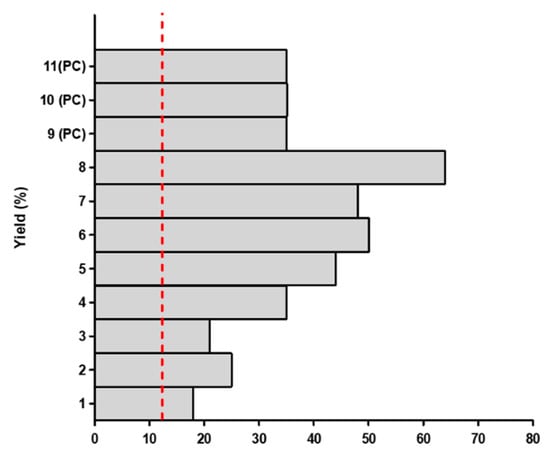 Evaluation of the yield of red propolis extract samples obtained by the solvent accelerated extraction method, where the vertical interrupted red line represents the cutoff of 11%.