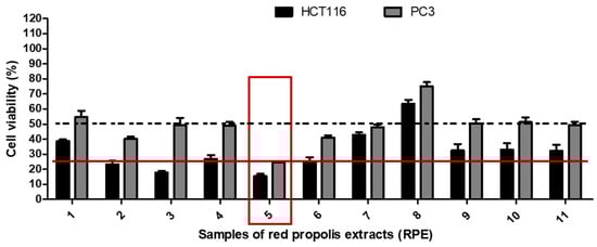 For screening purposes, the cytotoxic activity of a given product against tumor cell lines, either a plant extract or an isolated molecule, is considered moderate when the viability index is between 25% and 50% and strong when this index is less than 25%, whereas cell viability above 50% means no consistent cytotoxic activity. In the current study, the cytotoxic potential of the 11 samples was assessed using two different tumor cell lines, colon cancer (HCT116) and prostate (PC3). The choice for these cell lines was based on the high frequency of colon and prostate cancers worldwide []. As demonstrated in Figure 3, most samples showed at least moderate cytotoxic activity against HCT116 cells, except for sample 8, and against PC3, excluding samples 1 and 8. However, only sample 5 showed strong cytotoxic activity against both tumor cell lines.