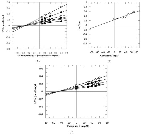 The inhibition of α-glucosidase by compound 3 (A) Lineweaver–Burk plot of reciprocal of rate of reaction (velocities) vs. reciprocal of substrate (p-nitrophenyl-α-D-glucopyranoside) in the absence (▲), and in presence of 30 (∆), 40 (■), 50 (□), 60 (●), and 70 µM (○) of compound 3. (B) Secondary replot of Lineweaver–Burk plot between the slopes of each line on Lineweaver–Burk plot vs. different concentrations of compound 3. (C) Dixon plot of reciprocal of rate of reaction (velocities) vs. different concentrations of compound 3.