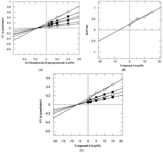 The inhibition of α-glucosidase by compound 4 (A) Lineweaver–Burk plot of reciprocal of rate of reaction (velocities) vs. reciprocal of substrate (p-nitrophenyl-α-D-glucopyranoside) in the absence (∆), and in presence of 2.5 (▲), 5 (■), 10 (□), 15 (●), and 20 µM (○) of compound 4. (B) Secondary replot of Lineweaver–Burk plot between the slopes of each line on Lineweaver–Burk plot vs. different concentrations of compound 4. (C) Dixon plot of reciprocal of rate of reaction (velocities) vs. different concentrations of compound 4.