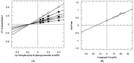 The inhibition of α-glucosidase by compound 5 (A) Lineweaver–Burk plot of reciprocal of rate of reaction (velocities) vs. reciprocal of substrate (p-nitrophenyl-α-D-glucopyranoside) in the absence (▲), and in presence of 10 (∆), 15 (■), 20 (□), 20 (●), and 25 µM (○) of compound 5. (B) Secondary replot of Lineweaver–Burk plot between the slopes of each line on Lineweaver–Burk plot vs. different concentrations of compound 5. (C) Dixon plot of reciprocal of rate of reaction (velocities) vs. different concentrations of compound 5.