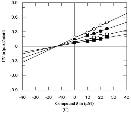 To investigate the mode of interaction and dissociation constant of these potent compounds, the kinetics studies on active compounds 3–5 and 11 were performed, with different concentrations of test compounds and substrates. These compounds inhibited the α-glucosidase enzyme in a concentration-dependent manner with Ki values were between 7.05 ± 0.75–51.15 ± 0.63 µM. From the kinetics studies, it was deduced that the compounds 3–5 and 11 are non-competitive inhibitors with Ki values in range 77.05 ± 0.75–51.15 ± 0.63 µM. The type of inhibition was determined by Lineweaver–Burk plots, the reciprocal of the rate of the reaction was plotted against the reciprocal of substrate concentrations to monitor the effect of inhibitor on both Km and Vmax. It was observed from Lineweaver–Burk plots that all compounds 3–5 and 11 clearly showed non-competitive inhibition Figure 3, Figure 4, Figure 5 and Figure 6A. In non-competitive inhibition, the Vmax of enzyme decreased, while Km are not affected. The Lineweaver–Burk plots (section A) of all Figure 3, Figure 4, Figure 5 and Figure 6 showed that in the presence of compounds 3–5 and 11 the Vmax of α-glucosidase enzyme decreased significantly, while the Km remain constant, which indicated the mixed-type of inhibition. The secondary replots of Lineweaver–Burk plots were used to determine the Ki values. The Ki values were calculated by plotting the slope of each line in the Lineweaver–Burk plots against different concentrations of compounds 3–5 and 11 (Figure 3, Figure 4, Figure 5 and Figure 6B). The Ki value was confirmed from Dixon plot by plotting the reciprocal of the rate of reaction against different concentrations of compounds 3–5 and 11 (Figure 3, Figure 4, Figure 5 and Figure 6C).