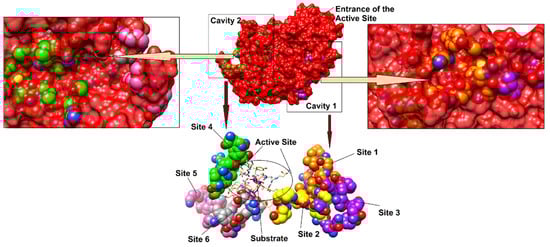 Structural topology of S. cerevisiae α-glucosidase is shown. The generated cavities are displayed in boxes. The predicted allosteric sites are shown in sphere model, each site is labeled. The active site residues (shown in yellow sticks) are presented in complex with the substrate molecule (isomaltose, shown in purple sticks).