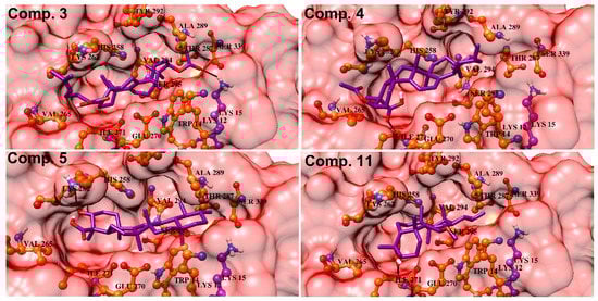 Docked orientations of compounds 3–5 and 11 are shown in the Cavity 1. The compounds are shown in purple sticks, hydrogen bonds are presented in black lines.
