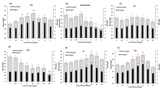 Screening of the effect of different concentrations of (A) KIN, (B) Melatonin, (C) SA, (D) ETA, (E) JA and (F) GA on biomass and DHA production in SW1 after 96 h of cultivation. Values and error bars represent the means and the standard deviations of triplicate experiments (n = 3). (*), (**) and (***) represents the statistical significance with respect to control values at p < 0.05, p < 0.01 and p < 0.001, respectively. The C represents the control of the experiment where no phytohormones were added to the medium.