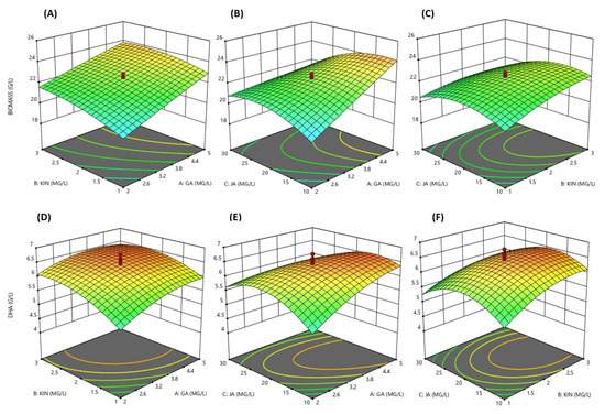 3D response surface visualization for the synergistic effect of KIN, JA and GA on biomass (A–C) and DHA (D–F) production by SW1.