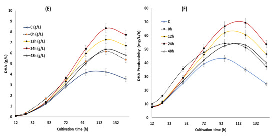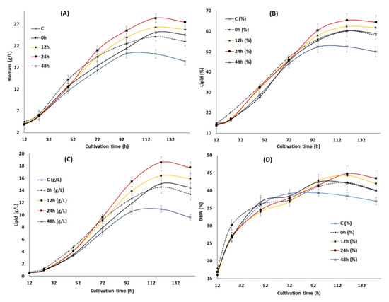 The optimal concentration of KIN, JA and GA obtained from the RSM experiment was supplemented at 0, 12, 24 and 48 h of cultivation and the impact on the growth, lipid and overall DHA production was assayed. The cultures were then cultivated for 144 h with a similar condition, as shown in Section 2.2. The data were analyzed using the mean and standard deviation of triplicate experiments.
