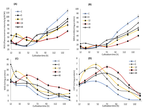 In order to elucidate the potential impact of KIN, JA and GA supplementation at different time points on the stress markers and oxidative defense systems of SW1, the concentrations of ROS and MDA, as well as the activities of SOD and CAT were determined. Cellular ROS comprises primarily superoxide anion (O2−), hydrogen peroxide (H2O2), hydroxyl radical (·OH), lipid hydroperoxides (LOO) and peroxyl radicals (LOO·) [38]. Our results showed that feeding of the phytohormones at different time points exhibited a different impact on the stress marker and antioxidant enzymes of SW1 (Figure 4). During the early to mid-stage of the cultivation (12–72 h), supplementation of the phytohormones was shown to immediately increase the ROS at a moderate level (from 30 to 60 fluorescence intensity/g CDW), approximately 0.5–1.5-fold higher than that of the control group. According to Piotrowska et al., [39] as well as Sivaramakrishnan and Incharoensakdi [40], addition of exogenous phytohormones induces an increase in the cellular respiration of microalgae, which in turn led to the increased production of ROS. This explained the higher cellular growth in the phytohormone supplemented group of SW1 in comparison to the control, as the importance of higher cellular respiration in the early stage of cultivation in promoting cellular growth and lipid production in thraustochytrids has been established [41,42]. In addition, previous studies have also reported that a moderate level of ROS was important to promote cell differentiation and proliferation in Chlorella spp. by acting as a signaling molecule that improves the cell growth and physiological responses [40]. Nevertheless, the ROS levels should be maintained at a moderate level as elevated ROS will be detrimental to the cells. In this study, the ROS levels in the groups supplemented after 0, 12 and 24 h were immediately lowered after the induction as the cells were still able to produce ample antioxidants to resist the oxidative stress. On the other hand, a different trend of the ROS level was observed when the phytohormones were supplemented at 48 h of cultivation where the deactivation of ROS was shown to be minimal in comparison to the other groups.