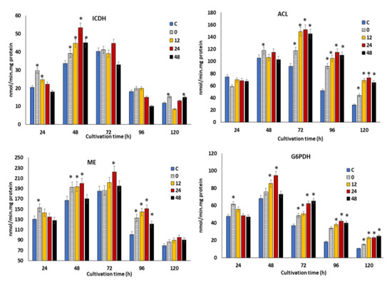 In the previous section, supplementation of the optimal concentration of KIN, JA and GA at different time points was shown to modulate the oxidative stress, which could directly promote the growth, lipid and DHA production in SW1. However, the potential impact of the phytohormones treatment at different time points on the key metabolic enzymes involved in the growth and fatty acid biosynthesis in SW1 remains vague. Therefore, the profiles of the specific activities of four key enzymes, namely glucose-6-phosphate dehydrogenase (G6PDH), malic enzyme (ME) NAD: isocitrate dehydrogenase (ICDH) and ATP: citrate lyase, were determined (Figure 5). The ICDH activity was determined due to its importance and implication in the initiation of lipogenesis. Upon cessation of growth and initiation of lipogenesis, the flux of carbon is diverted to lipid synthesis through the diminishing activities of ICDH [46]. Therefore, the changes in the specific activities of this enzyme could be correlated to growth and lipogenesis. Figure 5 shows the profiles of specific activities of the enzymes throughout the cultivation period. Maximum impact was observed in the 24 h group, achieving 55 nmol/mg protein at 48 h of cultivation, which is 38%, 20% and 22% higher than that of the 0, 12 and 48 h groups, respectively. This result explained the higher growth achieved in the 24 h phytohormone supplemented group. This result agrees with the finding by Geng at al [47] and Tang et al. [46], in that the higher growth observed in the engineered strain of Schizochytrium and Mucor circinelloides WJ11 coincide with higher ICDH activity. The activity of ICDH, however, rapidly decreased during the lipid accumulation phase in the control and all the phytohormone treatment groups.