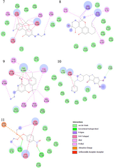 | Acetylcholinesterase (4PQE) | Ser-203 Glu-334 His-447 | Phe297 Phe338 Phe295 Trp286 | Ser125 Tyr341 Asp74 Tyr124 Trp286 Tyr237 Glu285 | Val294 Ser293 Trp286 Tyr72 Ser294 Tyr337 |
