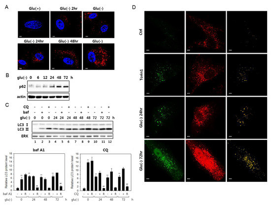 Glucose deprivation has been suggested to induce autophagy, although its flux is attenuated in certain cells [21,41]. We examined the status of autophagic flux in human fibroblasts under glucose deprivation and confirmed these findings. Puncta that are positive for LC3 signal increased as early as 2 h into glucose deprivation and continued increasing at least for 72 h (Figure 1A). Furthermore, multiple results indicated an attenuation of autophagy flux in these cells. The levels of p62 sequestosome (p62), an autophagosome cargo, the decrease of which is a marker for active autophagy flux [42], gradually increased (Figure 1B). Blockade of autophagy flux is also demonstrated in an experiment with bafilomycin A1 (bafA1), which inhibits autophagy flux through the inhibition of autophagosome-lysosome fusion, as well as lysosome acidification [26]. In glucose-deprived cells, the levels of LC3 type II molecules (LC3-II) increased steadily over 72 h, and bafA1 treatment did not further elevate the levels at each time point (shown in Figure 1C, lanes 4 vs. 5 and 7 vs. 8 and 10 vs. 11; this is better demonstrated in the bar graph below, which shows a substantial decrease of the ratio of LC-II proteins in bafA1-treated and untreated cells upon glucose deprivation). This trend is also seen in the case of chloroquine (CQ) treatment, although, in this case, the decrease in the ratio of LC-II proteins upon glucose deprivation. LC-II proteins levels were highly elevated upon chloroquine (CQ) treatment. Chloroquine blocks autophagosome-lysosome fusion but not lysosome acidification [35] and may affect the flux differently from bafA1. Autophagic flux blockade was further indicated in cells expressing a tandem fluorescence-tagged LC3 (tfLC3, a hybrid protein composed of GFP and RFP fused to LC3 [40]) (Figure 1D). In the transfected cells, green puncta represent autophagosomes, while red puncta represent mostly lysosome-fused autophagosomes, where the green fluorescence of tfLC3 is quenched in the acidic conditions of lysosomes [43]. Yellow puncta, which are largely absent in control cells, normally indicate naïve autophagosomes but also can represent autolysosomes with high pH. In cells treated with torin1, which induces ongoing autophagy, the number of yellow puncta increased, which represent autophagosomes. However, in glucose-deprived cells, yellow puncta were more prominent. Together, these data demonstrate impaired autophagy flux in fibroblasts under glucose deprivation.