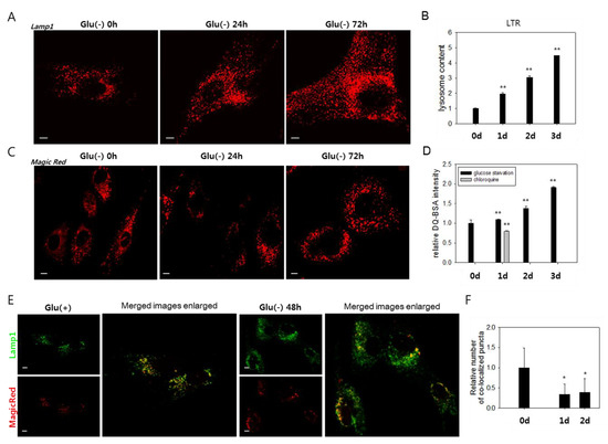 We investigated the molecular mechanisms underlying the failure of autolysosomal degradation in glucose-deprived cells. In glucose-deprived cells, a substantial increase in the number of lysosomes was detected by the increase of Lamp1-positive organelles (Figure 2A and Supplemental Figure S1A) and cellular content of the LysoTracker Red signal (Figure 2B). The increase of Lamp1 and Lamp2 protein levels further supports this finding (Supplemental Figure S2A). This change is attributed at least partially to an increase in lysosome biosynthesis, as evidenced by a gradual increase in the mRNA levels of Lamp1 and Lamp2, as well as cathepsins B and D (Supplemental Figure S2B). To determine whether the increased numbers of lysosomes include lysosomes with defects in degrading cargo materials, we analyzed the activities of the lysosomes using MagicRed or DQTM-BSA, which allow an in situ assessment of the proteolytic activities in endosomes and lysosomes [46,47,48]. Increases in the number of puncta positive for lysosomal protease activities were detected (Figure 2C,D). However, these changes were not as notable as that of the cellular lysosomal content (less than 1.4- and 1.9-fold increases vs. near 4- and 4.5-fold increases at 48 h and 72 h, respectively) (Figure 2B,D). Indeed, the number of lysosomal puncta that co-localized with those positive for Magic Red did not increase in glucose-deprived cells (Figure 2E,F). These findings indicate that a large number of lysosomes are not functional in glucose-deprived cells and that low lysosomal activity underlies the impaired autolysis.