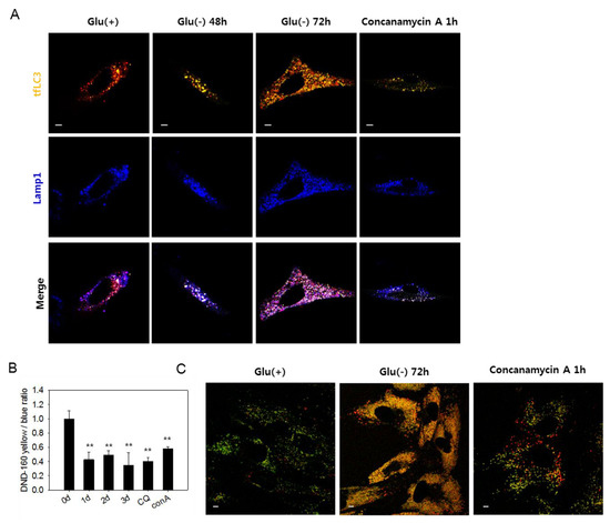 Lysosomes in glucose-deprived cells show low acidity. (A) GFP-RFP-LC3 (tfLC3)-positive puncta and lysosomes are visualized by confocal microscopy. Cells were transfected with ptfLC3 plasmid and incubated in the absence of glucose for 48 or 72 h or with 200 nM concanamycin A for 1 h to inhibit lysosome acidification. Cells were fixed, immunostained with anti-Lamp1 antibody (blue), and visualized with confocal microscopy. Merged and enlarged images are presented on the bottom. (B) Cells incubated in glucose-free medium for 1, 2, or 3 dor treated with 50 μM chloroquine for 6 h or 200 nM concanamycin A for 1 h were stained with Lysosensor yellow/blue DND-160 dye. After washing in phosphate-buffered saline, cells were examined by fluorometry, and relative lysosome acidity was determined as the relative value of yellow/blue fluorescence ratio. (C) Cells were incubated either in the presence or absence of glucose for 3 dor treated with 200 nM concanamycin A for 1 h. Approximately, 2 × 104 cells were then loaded with Lysosensor dye and visualized by confocal microscopy. Vesicles with low and high acidity are seen as red and green puncta, respectively. All scale bars in microscopy indicate 5 μm. Values are presented as the mean of two biological repeats ± S.D. * p < 0.05 and ** p < 0.01 by ANOVA.