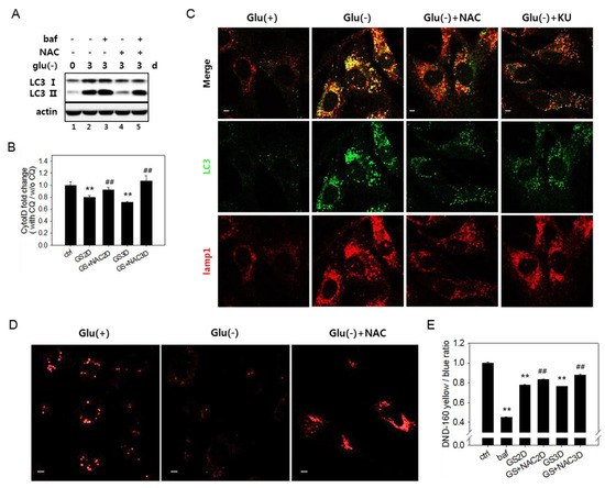 Increase inthe reactive oxygen species (ROS) level is related with a failure of lysosome acidification. (A) Autophagy flux was determined by immunoblotting analysis of the LC3-II protein. Cells were glucose deprived for three days in the presence or absence of 5 mM N-acetylcystein (NAC). Cells treated with 200 nM bafilomycin A1 (baf) for the last 6 h (lanes 3 and 5) served as a control for a full blockade of flux. (B) To determine the relative autophagic flow, cells were treated with 10 μM chloroquine (CQ) during the last 24 h. More than 2 × 104 cells were stained with Cyto-ID dye and examined by flow cytometric quantitation. Relative values (means of two biological repeats) of the measured ratios of fluorescence from CQ-treated and nontreated cells were plotted. # indicates a significance of the difference between the measured means of the cells untreated and treated with NAC. Supplementation of NAC (GS+NAC2D or GS+NAC3D) significantly attenuated the decrease of autophagic flow in cells undergoing glucose deprivation for two or three days (GS2D or GS3D). (C) To visualize the co-localization of autophagosomes and lysosomes, cells cultivated with or without 5 mM NAC (Glu(-)+NAC) or 0.5 μM KU60019 (Glu(-)+KU) over an incubation period of three days were subjected to immunofluorescence analysis for LC3 (green) and Lamp1 (red) and observed by confocal microscopy. The upper panels show overlapped and enlarged images. Yellow puncta are abundantly present in glucose-deprived cells but are dramatically reduced in cells treated with NAC. (D) Cells on cover slips were cultivated for three days with or without 5 mM NAC, stained with Lysosensor DND-160 dye, and observed by fluorescence of the lysosensor dye emitted at 540 nm. (E) Lysosome acidity was determined quantitatively using Lysosensor DND-160 dye. Cells treated with 100 nM bafilomycin A1 for 1 h served as the negative control. All scale bars in microscopy indicate 5 μm. Values are presented as the mean of two biological repeats ± S.D. *p < 0.05 and **p < 0.01 by ANOVA.