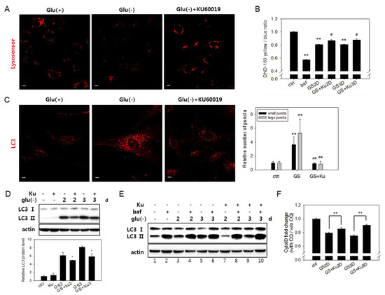 Lysosomal acidity and autophagosome numbers are restored by ataxia telangiectasia mutated (ATM) inhibition. (A) Cells on cover slips were incubated with or without 0.5 μM KU60019 for three days. Lysosomal acidity was visualized by treating cells with Lysosensor DND-160 dye and using confocal microscopy with emissions at 540 nm. (B) Cells were treated in the absence (GS) or presence of 0.5 μM KU60019 for two or three days (GS+Ku2D or GS+Ku3D). Relative lysosomal acidity was quantitatively determined as the relative value of the yellow/blue ratio of fluorescence measured by fluorometry. # indicates the significance of the difference between the measured means of the cells untreated and treated with KU60019. (C) Cells incubated for three days with or without 0.5 μM KU60019 were immunostained with antibody against LC3 and visualized by confocal microscopy. Puncta that are positive for LC3 signal were divided according to diameter (larger or smaller than 1.5 μm), and the numbers of each population in more than 40 cells were counted. Black and grey bars represent the mean numbers of small and large autophagosome puncta in glucose-deprived cells compared with control cells, respectively. (D) and (E) Levels of the LC3-II protein determined by immunoblotting analysis in cells incubated for two or three days in the absence or presence of 0.5 μM KU60019 (Ku). In (E) cells treated with 200 nM bafilomycin A1 (baf) for the last 6 h served as a control for the full blockade of flux. (F) To determine the relative autophagic flow, cells were treated with 10 μM chloroquine (CQ) during the last 24 h. Approximately, 2 × 104 cells were stained with Cyto-ID dye and examined by flow cytometric quantitation. Relative values of the measured ratios of fluorescence from CQ-treated and nontreated cells were plotted. # indicates the significance of the difference between the measured means of the cells untreated and treated with KU60019. All values are presented as the mean of two biological repeats ± S.D. * or # p < 0.05 and ** or ## p < 0.01 by ANOVA.
