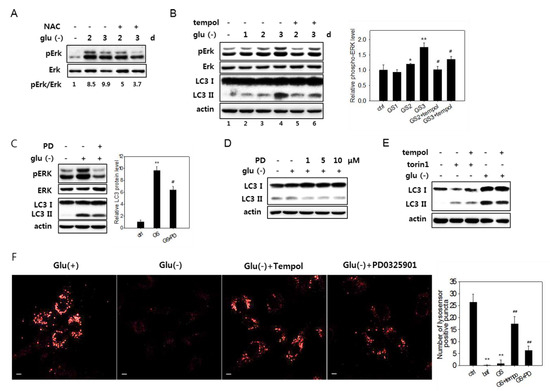 A treatment with NAC or 2,2,6,6-tetramethylpiperidin-1-oxyl (tempol), a superoxide scavenger [57], blocked Erk activation (Figure 6A,B). This demonstrates that ROS generated upon glucose deprivation induced the activation of the MAPK pathway. Importantly, the attenuation of Erk activation by antioxidant treatment alleviated the flux impairment in glucose-deprived cells, as shown by the decrease in the levels of LC3-II in cells treated with tempol (Figure 6B, lanes 3 and 4 vs. 5 and 6). The direct inhibition of Erk activity by PD325901, an inhibitor of MAPK signaling, also lowered the levels of LC3-II (Figure 6C,D). Tempol treatment did not affect the changes in the levels of LC3-II in cells treated with torin1 and undergoing autophagy with normal flux (Figure 6E), suggesting that the change in glucose-deprived cells is an event specific to high levels of ROS. Finally, the treatment of PD325901 during glucose deprivation attenuated the decrease of lysosensor signals (Figure 6F), demonstrating that Erk inactivation prevents or lessens the failure in lysosome acidity. These results together suggest that ROS-induced Erk activation causes poor acidification of lysosomes and impairs autolysis in glucose-deprived cells. We also found that acidic lysosomes in PD325901-treated cells increased but showed fewer numbers of puncta (Figure 6F, right panel) and reduced intensity than those in tempol-treated cells, leaving room for an additional effect of lowered ROS levels in glucose-deprived cells. This may be attributed to the effects contributed by the ATM-mediated impairment of lysosome acidity. However, whether the simultaneous inactivation of ATM and Erk additively increases lysosomal acidity to the levels of NAC or tempol was not determined.