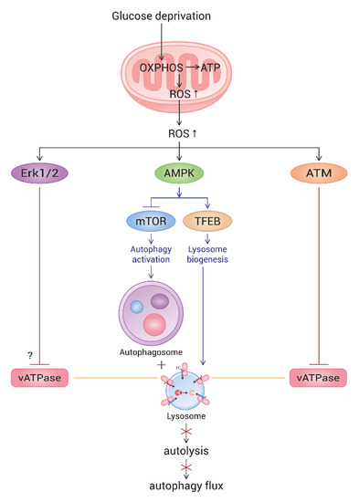 Schematic pathway of ROS-triggered autophagy flux impairment in glucose-deprived cells. Upon glucose deprivation, cells increase mitochondrial ATP production through enhancing OXPHOS. As a result, ROS are highly generated from mitochondria. Mitochondrial elongation also contributes to the elevation of ATP and ROS generation. High levels of ROS activate AMPK, which, in turn, triggers autophagy and lysosome biogenesis. However, ROS also activate ATM and Erk, both of which impair lysosome acidity by the inhibition of vesicular ATPase (vATPase). This overrides lysosome biogenesis and attenuates autolysis. As an outcome, glucose-deprived cells show a blocked autophagy flux. The mechanism underlying the Erk-mediated impairment of lysosome acidity is not yet known.