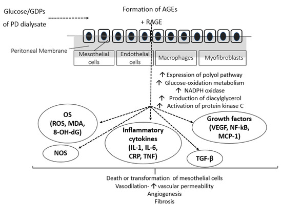 Hyperglycemia is the main determinant for development of diabetic microvascular complications. It has been hypothesized that hyperglycemia results in peritoneal damage through pathophysiologic mechanisms, similar to those that lead to glomerular diabetic injury. During the heat sterilization of PD solutions, glucose degradation products (GDPs) are accumulated in the dialysate. When the PMCs are exposed to the bioincompatible PD fluid characterized by high glucose and GDPs concentrations, GDPs undergo further non-enzymatic chemical reactions and become irreversibly heterogenous reactive molecules, the advanced glycation end-products (AGEs). GDPs affect the PM either directly or indirectly through the increased accumulation of AGEs in the PM. As PD fluid enters the peritoneal cavity, AGEs upregulate the expression of their specific multi-ligand, transmembrane receptor (RAGE), and accumulate around the PM. Intracellular formation of AGEs cause peritoneal cell injury through three mechanisms. AGEs cause a morphologic modification of intracellular proteins, modify the structure of extracellular matrix components and receptors expressed on the surface of the peritoneal cells, and, finally, AGEs and AGE-modified proteins bind tightly to RAGE on macrophages and endothelial cells. This binding triggers formation of ROS, which in turn activate pro-inflammatory molecules, cytokines, transcriptional, and growth factors, such as nuclear factor kappa-light-chain-enhancer of activated B cells (NF-kB) and vascular endothelial growth factor (VEGF), leading to abnormal transcription of DNA and apoptosis. Moreover, the free radicals that are generated by the AGEs-RAGE interaction further upregulate the generation of AGEs, forming a vicious cycle. The OS state in the peritoneal cavity is a combined result of overproduction of ROS and impaired antioxidant defense mechanisms. The extent of the glycoxidation-derived peritoneal cell damage depends on other parameters, as well, such as genetic factors that may pre-determine the characteristics of the PM and the extent of natural antioxidant defense mechanisms and the presence of systematic disorders, like hypertension, diabetes, and dyslipidemia [10].