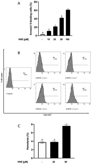 When compared to the percentage of eryptotic cells, these values demonstrate that, in the process underlying HNE-induced RBC death, eryptotic mechanisms dominated over the necrotic ones. These results are also in line with those reported from our research group with other lipidic, proeryptotic stimuli such as oxysterols with which HNE seems to share the ability to stimulate predominantly eryptotic events [35]. Interestingly, present findings could also imply that, in vivo, HNE at physiopathological concentrations could eventually injure erythrocytes to an extent far from significantly inducing intravascular haemolysis and its detrimental clinical sequelae (gastrointestinal, cardiovascular, pulmonary, urogenital, and clotting disorders) [1,36,37].