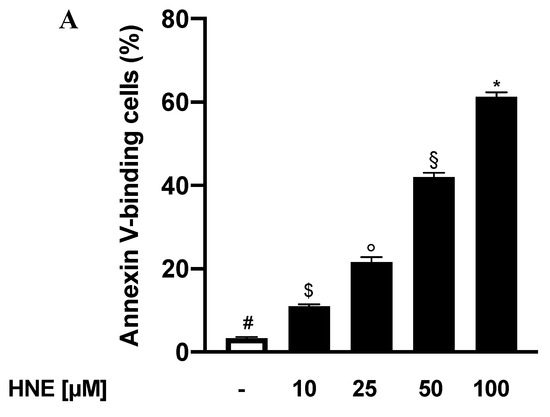 HNE, instead of a mere by-product of oxidative stress, is capable of modifying nucleophilic residues and, depending on its concentration, can either orchestrate cell signalling events or modify target proteins, thus dysregulating functional cellular processes such as proliferation and apoptosis [10,20,24,25,26,27,28,29,30,31,32]. In this paper, we focused on the HNE ability to modulate proapoptotic pathways and evaluated its eventual proeryptotic effects in a concentration range of pathophysiological relevance. As an initial approach toward this aim, HNE-induced PS externalized was assessed by incubating RBCs for 24 h in the absence (control) or in the presence of the aldehyde in the range between 10 and 100 µM. When compared to control cells, stimulation with HNE resulted in a significant, concentration-dependent increase of PS externalized expressed as % of Annexing V-binding cells. Indeed, the value progressively raised from 3.4% ± 0.2% with control cells to 61% ± 3% with 100 µM HNE (p < 0.05, Figure 1A,B). Successive experiments were, then, conducted with HNE between 25 and 50 µM, a concentration range frequently found in the plasma of obese subjects and patients affected by cardiometabolic and inflammatory pathologies [1,2,3,4]. Moreover, both in vitro and ex vivo evidences have reported that HNE concentrations close to 50 µM induce insulin resistance in muscle cells, in isolated skeletal muscle, and in adipocytes [14,33,34].