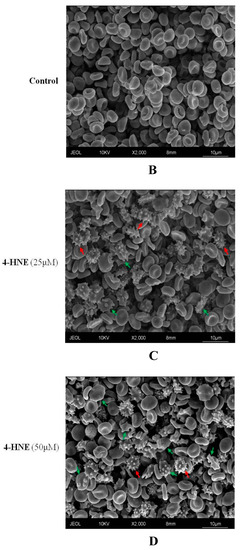 In order to further investigate these discrepancies, we next employed a SEM approach and analysed the morphological alteration in eryptotic RBCs. Figure 2 shows the onset after treatment with HNE for 24 h (Figure 2C,D) of altered cell morphologies not detectable in untreated samples (Figure 2B). Control RBCs have a shape and size comparable to the standards described in literature [38]. The acanthocytes (green arrow) appear characterized by a few irregular spicules with a blunt tip. These changes in their morphology are irreversible, while the echinocytes (red arrow), called porcupine cells or burr cells, show numerous narrow-tipped spicules regularly distributed on the surface of the red cell membrane. The latter alterations are instead considered reversible. The presence of numerous and irregular blebbing on the surface of eryptotic RBCs agrees with the apparent increase in volume detected by FSC and would exclude an actual increase of cellular volume.