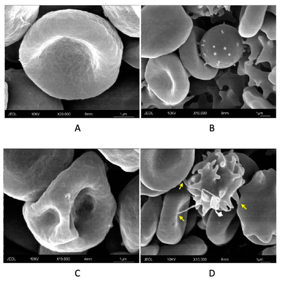 SEM analysis of control RBC (A), primary echinocyte (B), polyhedrocyte (C), and agglutination between eryptotic RBCs with fusion elements indicated by the yellow arrows (see text) (D): Images are representative of six independent experiments carried out in triplicate.