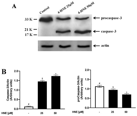 In light of the morphological changes triggered by HNE in eryptotic RBCs, we next evaluated the involvement of caspase-3 in the HNE-induced eryptosis. To this end, RBCs were incubated for 24 h in the absence (control) or in the presence of HNE in the range between 25 and 50 µM and caspase-3 cleavage was evaluated. With respect to control RBCs, stimulation with HNE at 25 and 50 µM significantly modified caspase-3 levels that increased from a control value of 0.12 ± 0.01 Arbitrary Units (AU) to 1.45 ± 0.2 and 1.73 ± 0.1 AU respectively. Conversely, procaspase-3 levels decreased from 1.13 ± 0.04 AU to 0.94 ± 0.05 and 0.70 ± 0.05 AU (p < 0.05, Figure 4).