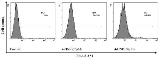 As abovementioned, a wealth of studies confirmed a strict correlation between Ca++ increase and the activation of signalling processes that ultimately lead to activation of erythrocyte scramblase responsible for PS externalization [1,4,6]. In order to gain deeper insights on the mechanisms responsible for the HNE-induced eryptosis, we next evaluated the involvement of Ca++ in PS externalization. To this end, RBCs were incubated for 24 h in the absence (control) or in the presence of HNE in the range between 25 and 50 µM and Ca++ endocellular levels were evaluated and expressed as % of positive cells. As shown in Figure 5, HNE determined an increase of intracellular Ca++ with values rising from a control value of 1.8% ± 0.2% to 20.5% ± 0.4% and 41.5% ± 0.4% with 25 and 50 µM HNE, respectively (p < 0.05).