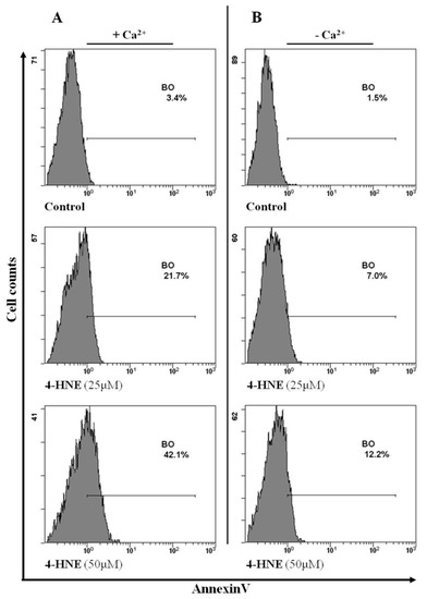 To confirm the role of Ca++ in the eryptotic process, RBCs were incubated with HNE either in the absence or in the presence of Ca++ and PS externalization was evaluated. As expected, absence of Ca++ resulted in a significant reduction of PS externalization, induced by HNE at 25 or 50 µM, by 68% ± 1% and 72% ± 1% respectively (p < 0.05, Figure 6).