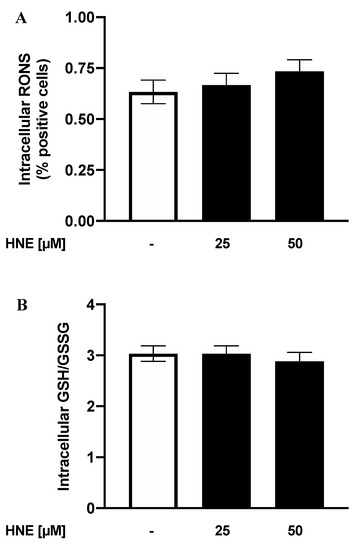 RBCs are considered “reporter cells” for the oxidative state since they can be particularly vulnerable to RONS due to their constant exposure to by-products generated by autoxidation of haemoglobin [50]. Moreover, oxidative stress has been associated in phospholipid remodeling and cell dysfunction in a number of eryptotic processes associated with several clinical conditions such as heart failure, diabetes, anaemia, and chronic inflammatory diseases [2,3,4,5,6]. Oxidative stress is, indeed, effective at least in part by activating Ca2+-permeable NSCM channels and by initiating a series of events ultimately leading to cell shrinkage and PS externalization [51]. In light of our present results underlying the key role exerted by Ca2+ in our experimental system, we next evaluated the involvement of oxidative stress in HNE-induced eryptosis. To this end, RBCs were incubated for 24 h in the absence (control) or in the presence of HNE between 25 and 50 µM and both endocellular RONS and GSH/GSSG levels evaluated. As shown in Figure 7, HNE did not induce any variation of intracellular levels of both RONS and GSH/GSSG at all the concentration tested.