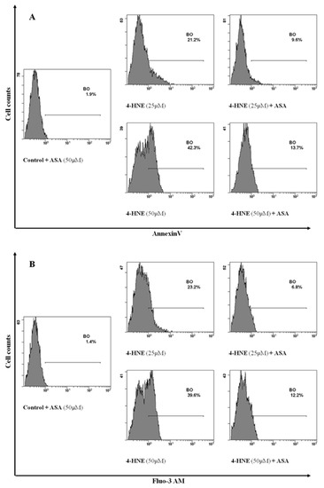 PGHS and PGE2 are deeply involved in the eryptotic signalling induced by several stimuli, through the opening of NSCM channels that leads to an increase of cytosolic Ca++ levels. Along these lines, we therefore evaluated whether the Ca++ influx in HNE-treated RBCs was dependent by activation of PGHS. To this end, RBCs were preincubated either in the absence or in the presence of 50 µM ASA and stimulated with HNE in the range between 25 and 50 µM, and then, both endocellular Ca++ levels and PS externalization were evaluated. As shown in Figure 8, with respect to RBCs stimulated with HNE at 25 and 50 µM, pretreatment with ASA resulted in a reduction of PS externalization by 55% ± 1% and by 68% ± 2%, respectively; similarly, Ca++ release was reduced by −71% ± 2% and −69% ± 1%, respectively.