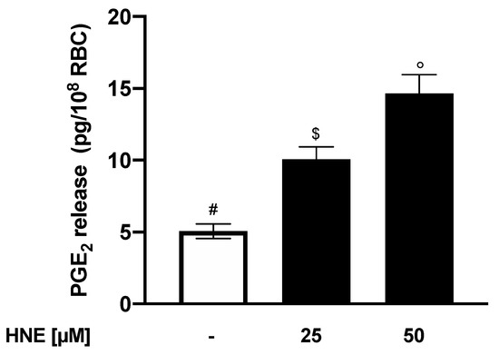 PGE2 release from HNE-treated RBCs: Values are means ± SD of six independent experiments carried out in triplicate. Bars with special characters are significantly different with p < 0.05 (ANOVA associated with Fisher’s correction).
