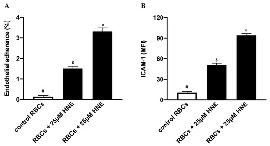 (A) Percentage of adherence to endothelial cells (ECs) of HNE-stimulated RBCs. (B) ICAM-1 expression in ECs co-incubated with HNE-stimulated RBCs: Incubation conditions and measurement of cell adherence or ICAM-1 expression were as reported in the Section 2.8. Controls were HNE-untreated RBCs. Values are means ± SD of six independent experiments carried out in triplicate. Bars with special characters are significantly different with p < 0.05 (ANOVA associated with Fisher’s correction).