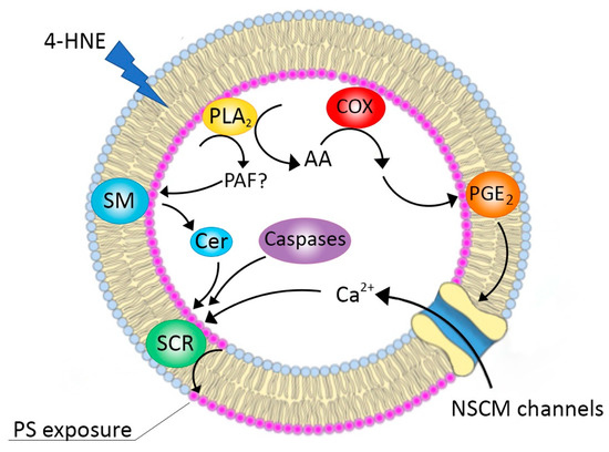 Schematic representation of the proposed mechanisms for HNE-induced eryptosis. SM: sphingomyelinase; Cer: ceramide; SCR: scramblase; NSCM: non-selective cationic membrane; COX: cyclooxygenase; AA: arachidonic acid; PAF: platelet aggregation factor; PLA2: phospholipase A2.