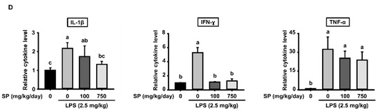 Pro-inflammatory cytokines play crucial roles during inflammatory responses [27,28,29]. To determine whether SP affects release of pro-inflammatory cytokines, mouse serum was collected by cardiac puncture at the time of the euthanasia and the amounts of IL-1β, TNF-α, and IFN-γ in serum were measured. Compared with the non-injected control group, LPS injection increased the concentrations of all of these cytokines. However, cytokine levels in the group orally administrated SP were similar to those in the control group (Figure 1D). Thus, SP has a marked anti-inflammatory effect in LPS-stimulated C57BL/6 mice.