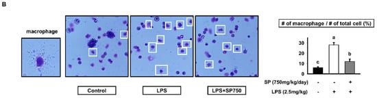 Experimental mice were orally administrated SP (0 or 750 mg/kg/day) for 7 days and euthanized 3 h after the intraperitoneal injection of LPS (2.5 mg/kg). Peritoneal lavage fluid was isolated and centrifuged at 16,000× g for 15 min to separate cells from supernatant. Red blood cells were lysed in ACK lysis buffer (Lonza). The remaining cells were suspended in cold PBS, counted, and centrifuged onto microscope slides (800× g for 5 min) using a Thermo Cytospin 4 Cytocentrifuge (Thermo Fisher Scientific, Waltham, MA, USA). Slides were fixed in methanol, dried, and placed in diluted Giemsa solution for 30 min. Finally, stained slides were rinsed in deionized water and photographed under a Nikon Eclipse E600 microscope (Nikon Corporation, Tokyo, Japan).