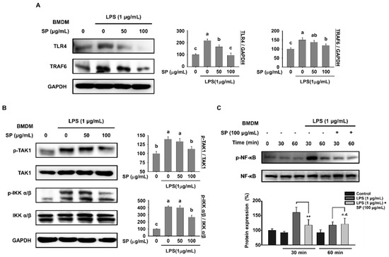 Anti-inflammatory effects of SP in bone marrow derived macrophages (BMDMs) are mediated via the toll like receptor 4 (TLR4) signaling pathway. BMDMs pretreated with SP (0, 50, and 100 µg/mL) for 3 h and stimulated with LPS (1 µg/mL) for another 18 h were subjected to western blot analysis to detect (A) TLR4 and TRAF6, and (B) p-TAK1, TAK1, p-IKK α/β, IKK α/β, and GAPDH (mean ± SEM; n = 3). TAK1 and IKK α/β were used as controls for p-TAK1 and p-IKK α/β, respectively. Data were analyzed quantitatively using ImageJ software. (C) Expression of p-NF-κB and total NF-κB in BMDMs pretreated with SP (100 µg/mL) for 3 h and stimulated with LPS (1 µg/mL) for the indicated times was examined by western blotting. NF-κB was used as a control for p-NF-κB (mean ± SEM; n = 3, **p < 0.01). Statistical significance was determined using Student’s t-test or one-way ANOVA followed by Duncan’s test. Datasets denoted by different letters are significantly different (p < 0.05, a > b > c).