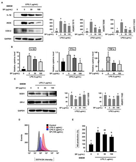 Effects of SP on pro-inflammatory cytokines and oxidative stress in BMDMs. (A) BMDMs pretreated with SP (0, 50, and 100 µg/mL) for 3 h and stimulated with LPS (1 µg/mL) for another 18 h were subjected to western blot analysis to detect pro-inflammatory cytokine and mediators (mean ± SEM; n = 3). GAPDH served as a control. Data were analyzed quantitatively using ImageJ software. (B) The culture medium from BMDMs was collected and the levels of IL-1β, IFN-γ, and TNF-α were measured by ELISA (mean ± SEM; n = 4). (C) Expression of SOD1 and GPx1 in BMDMs pretreated with SP (0, 50, and 100 µg/mL) for 3 h and then stimulated with LPS (1 µg/mL) for 18 h was examined by western blotting. (D) ROS production by BMDMs pretreated with SP (100 µg/mL) for 3 h and treated with LPS (1 µg/mL) for 18 h was measured by flow cytometry following incubation with DCFH-DA (mean ± SEM; n = 3). (E) BMDMs were pretreated with SP (0, 50, and 100 µg/mL) for 3 h and then stimulated with LPS (1 µg/mL) for 18 h, and the level of NO in the culture medium was assessed in a Griess reagent assay (mean ± SEM; n = 3). Statistical significance was determined using a one-way ANOVA followed by Duncan’s test. Datasets denoted by different letters are significantly different (p < 0.05, a > b > c > d).