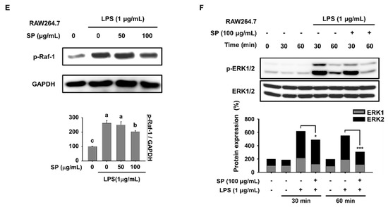 The TLR family, especially TLR4, is a class of proteins that plays a key role in the innate immune system [46]. TLR4 is a PRR found in Drosophila melanogaster and mammals; this PRR binds to the PAMP LPS, which was expressed and shed by Gram-negative bacteria [9,47,48]. We examined the spleen, lymph nodes, and serum from SP-treated mice to determine whether SP suppresses LPS-induced inflammation through TLR4 signaling. SP decreased LPS-mediated expression of TLR4, iRAK4, TRAF6, and TAK1 at the mRNA and protein levels. Significant differences were noted between control and test animals at both low (100 mg/kg/day) and high (750 mg/kg/day) SP concentrations (Figure 1B,C). Since the spleen and lymph nodes are innate immune organs that harbor active macrophages, we used BMDMs and RAW264.7 cells to examine the effect of SP on TLR4 signaling. We found that SP inhibits LPS-induced inflammation by downregulating expression of TLR4 signaling molecules TLR4, TRAF6, TAK1, and IKKα/β in both BMDM and RAW264.7 cells (Figure 3A,B and Figure 5B,C). TLR4 bind to LPS to induce activation and translocation of NF-κB to the cell nucleus [49]. Therefore, we examined LPS-induced expression of NF-κB at 0, 30, and 60 min since translocation occurs within 1 h after the LPS stimulus [49,50]. SP reduced LPS-induced expression of NF-κB in BMDMs and RAW264.7 cells in 30 min (Figure 3C and Figure 5D). TLR4 signaling activates MAPK signaling, which also plays key role in regulating inflammation [51]. We also found that SP reduced LPS-induced expression of Raf-1, a member of the ERK pathway (Figure 5E). SP suppressed LPS-induced phosphorylation of ERK at 30 and 60 min (Figure 5F). Totally, SP also indicated the possibility of regulating inflammatory response by LPS through MAPK signaling suppression activated by LPS-indicated TLR4 signaling.